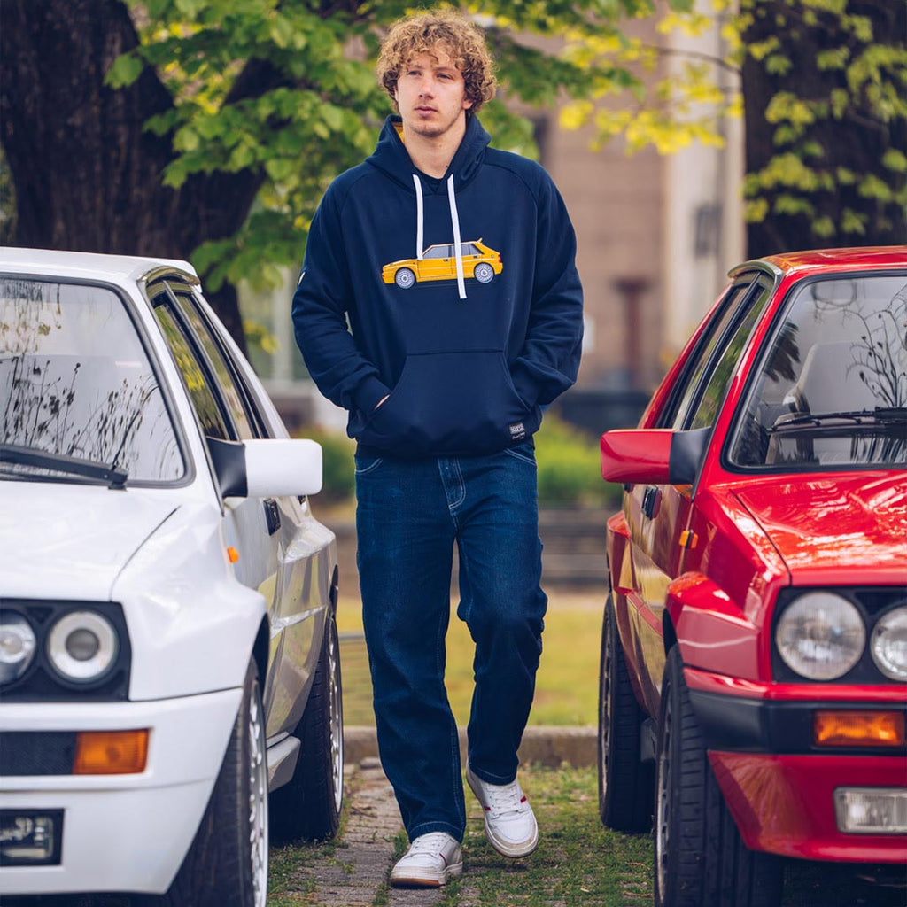Alliant style et confort, ce sweat arbore une broderie détaillée de la Lancia Delta HF jaune sur le devant, tandis que l’inscription "integrale" dans le dos rappelle son héritage mythique.