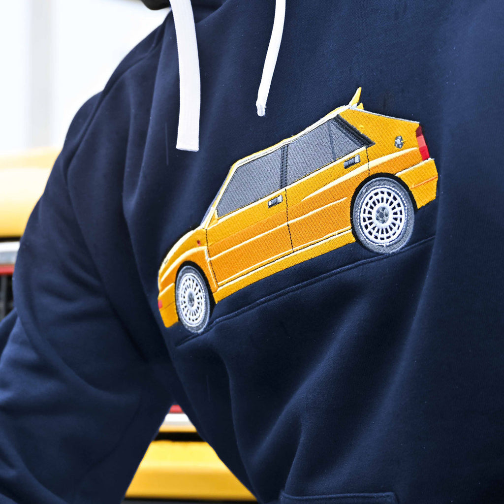 - Design exclusif : Broderie détaillée de la Lancia Delta HF jaune sur la poitrine.